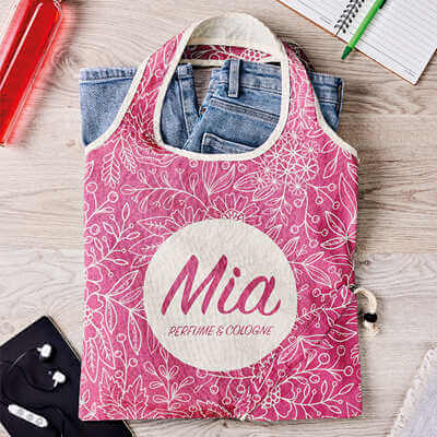 Faltbare, maßgeschneiderte Einkaufstasche aus Baumwolle mit Kordelzug an der Tasche und kurzen Griffen. Die Tasche kann vollflächig in Farbe bedruckt werden. Abmessungen der Tasche: 38x50cm. Die Tasche ist in 2 Baumwollgewichten pro m2 erhältlich, 105 g/m2 und 140 g/m2. Sie können die natürliche oder schwarze Farbe der Kordelzüge wählen.