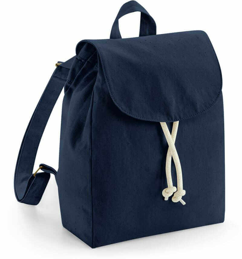 340 g/m², 100% Baumwolle (kbA), Canvas-Material, Umschlagklappe mit sicherem Druckknopf, Kordelzugverschluss, verstellbare Schultergurte aus gleichem Material, Tragegriff, Fassungsvermögen: 5 Liter, Maße: 22x30x12 cm