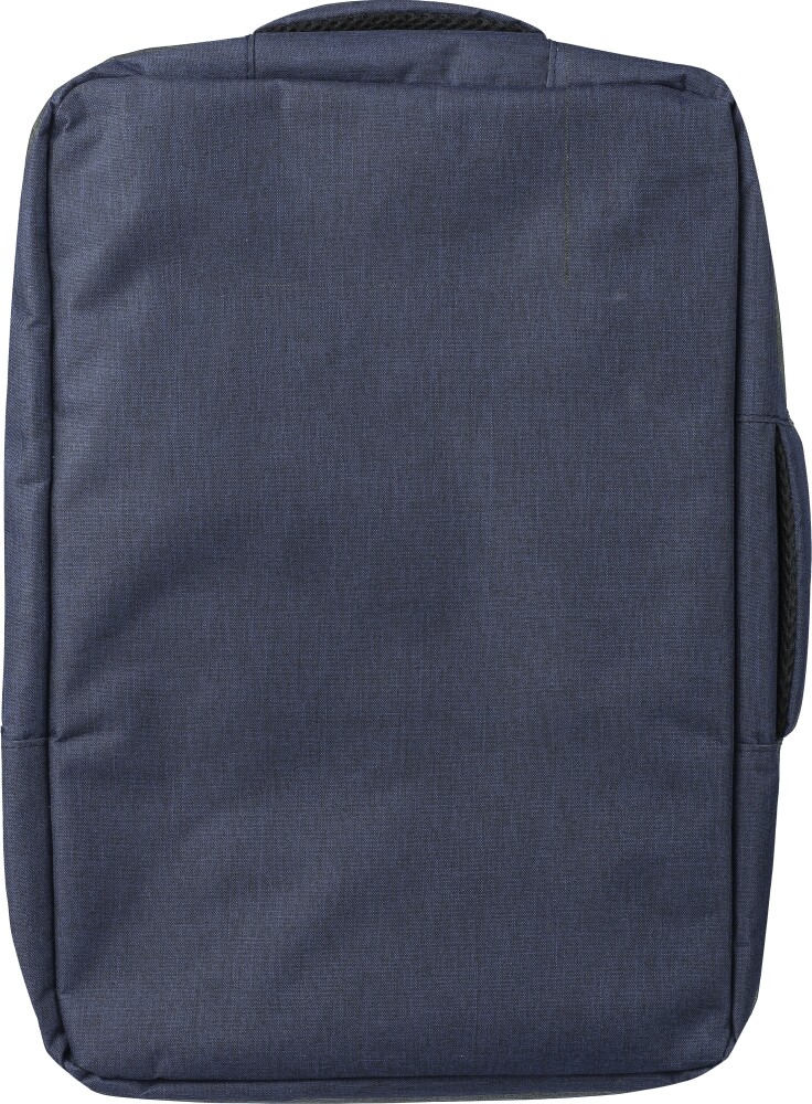 rPET polyester (300D) backpack and laptop bag (15 inch) with 210D lining inside. Cabin-proof. With carrying loop on top, adjustable shoulder straps, and two carrying handles on the side. Adjustable straps tuck behind the padding for a carry function with side handles. Velcro laptop compartment and small zippered compartment. With ventilated padded backing. Carrying weight approx. 8 kg. Includes rPET label. Dimensions: 28 x 40,5 x 11 cm