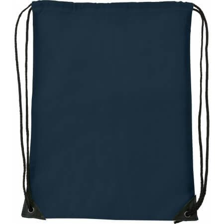 Polyester (210D) drawstring backpack with solid corners and nylon drawstrings.