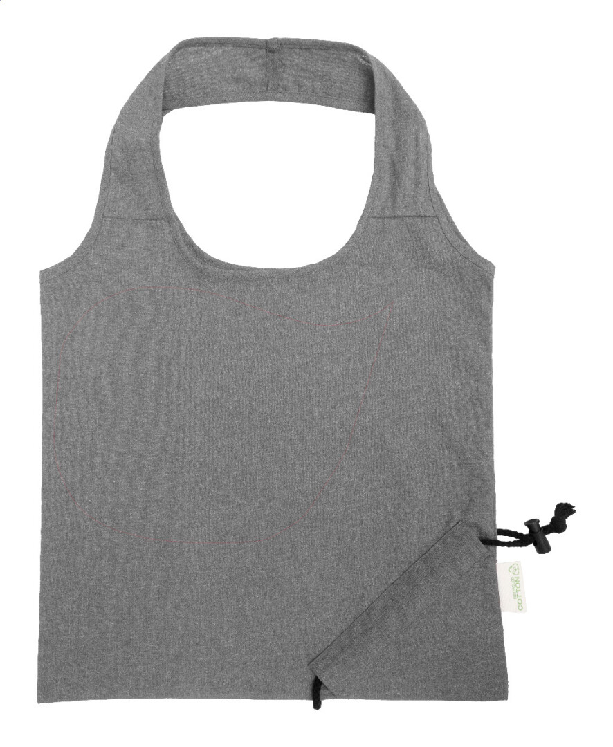 Faltbare Einkaufstasche aus 70 % recycelter Baumwolle und 30 % Polyester RPET, 140 g/m². Mit einem markanten Etikett aus recycelter Baumwolle. Neu. Go Green. Taschenkapazität: 10 kg. Taschenvolumen: 9,8 l
