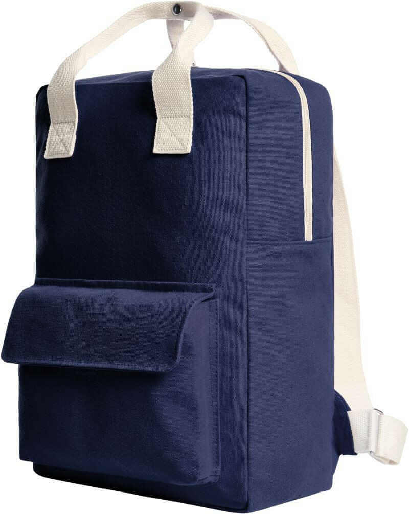 Material: Baumwolle 12 OZ, PVC-frei. 12 Unzen, Griffe mit Knopf, verstellbare Schulterriemen, Fronttasche mit Reißverschluss, flache Innentasche, Hauptfach mit 2-Wege-Reißverschluss, Volumen 18 l, Maße 27x38x13cm.