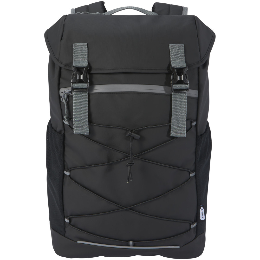 Wasserdichter Laptop-Rucksack aus GRS-zertifizierten, recycelten Materialien, einschließlich Reißverschlüssen. Enthält ein geräumiges 15,6"-Laptopfach mit Kordelzug und verstellbaren Schnallen, um den Stauraum unter der flexiblen Abdeckung zu maximieren. Der Rucksack verfügt über mehrere Taschen, darunter eine Vordertasche mit Reißverschluss und elastischen Kordelzügen zur Aufbewahrung und Organisation sowie eine reflektierende Verzierung für bessere Sichtbarkeit. Das konturierte und gepolsterte Polster und der verstellbare Brustgurt sorgen auch bei voller Beladung für einen bequemen Sitz. Der Hauptstoff, das Futter, die Gurte und die Reißverschlüsse sind aus recycelten GRS-Materialien hergestellt. Fassungsvermögen: 23 Liter. PVC-frei.