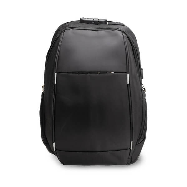 Backpack with a 15" laptop compartment secured with a lock with individual lock. Outside, zipped front pocket and USB socket on the side, thanks to which you can connect your smartphone to a power bank. USB cable included. Soft, comfortable back and shoulder straps are covered with mesh. The backpack has a strap for the suitcase handle. The backpack prevents access by other people.