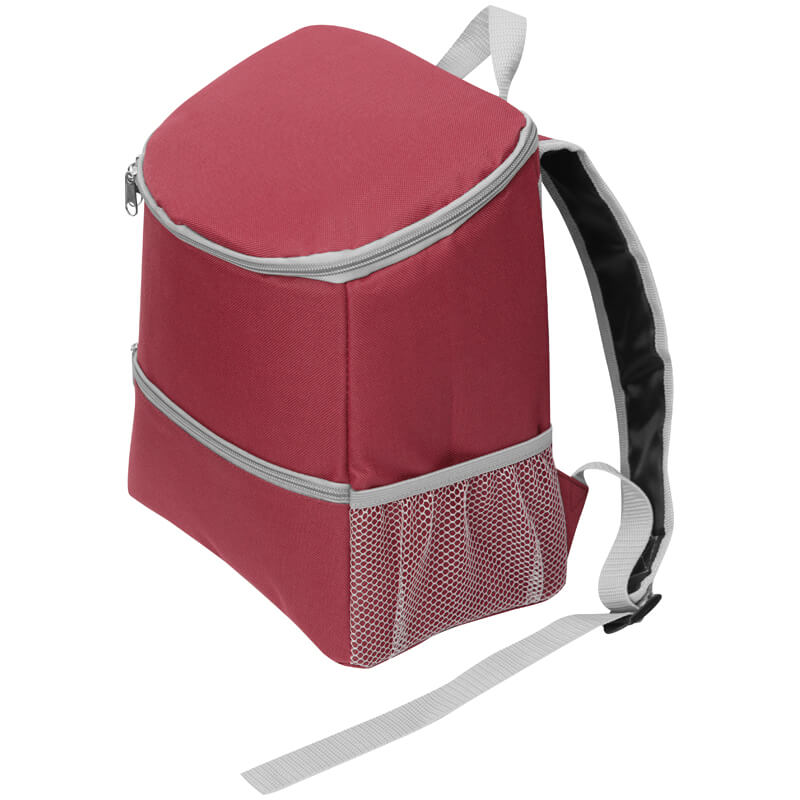 Polyesterový ruksak a chladiaca taška v jednom s polstrovanými ramennými popruhmi, sieťovanými bočnými priehradkami a malým vreckom na zips vo vnútri.