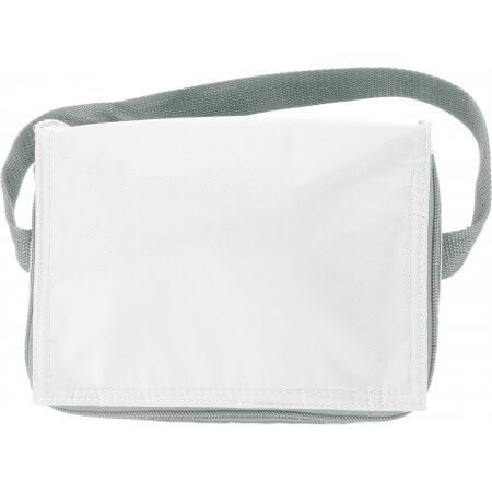 Polyester (600D) cooling bag with a front pocket and two mesh side pockets, one large compartment, a carry handle and an adjustable carry strap.