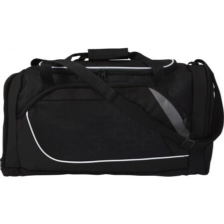 Polyester (600D) sports/travel bag with various zippered compartments and a reflective strip. With adjustable carry strap.