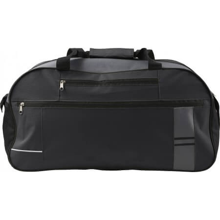 Polyester (600D) sports/travel bag with front zipped pocket and a mesh pocket on both sides. Adjustable shoulder strap.