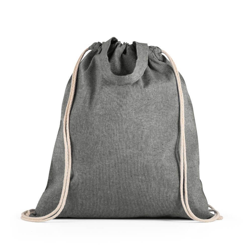 Kordelzugtasche aus recycelter Baumwolle (140 g/m²) mit 30 cm langen Henkeln und Baumwollkordeln zur Befestigung. 370 x 410 mm