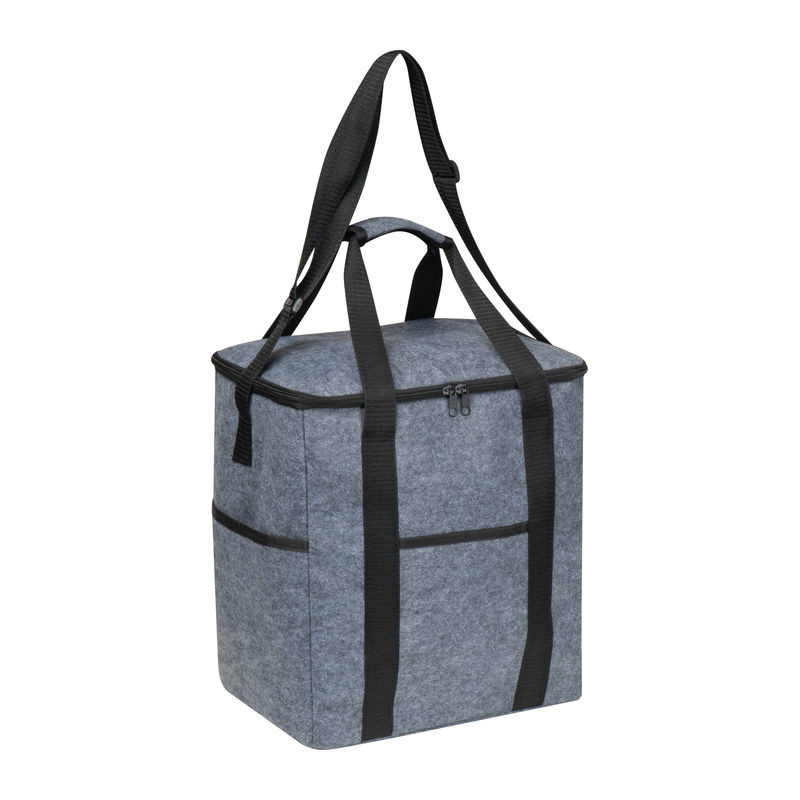 Kühltasche aus Recyclingfilz mit einem Innenfach, zwei seitlichen Außenfächern und einem Fach auf der Vorderseite. Nachhaltig und praktisch für unterwegs.