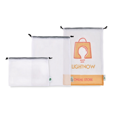 Súprava 3 sieťovaných vrecúšok na čerstvé potraviny vyrobená z RPET sieťoviny (certifikovaná pre styk s potravinami, FCA), s čiernym alebo bielym ABS uzáverom a farebnou polyesterovou šnúrkou. Balené v prispôsobiteľnom papierovom obale. 1-4 farebná potlačená etiketa alebo tkaná etiketa (cca 4x4cm) je v cene. Každá taška môže mať iný dizajnový štítok. Rozmery vrecúšok: 30x20cm, 30x35cm a 30x40cm (Vzhľadom na povahu materiálu majú veľkosti toleranciu do 2cm.). Možno prať v práčke.