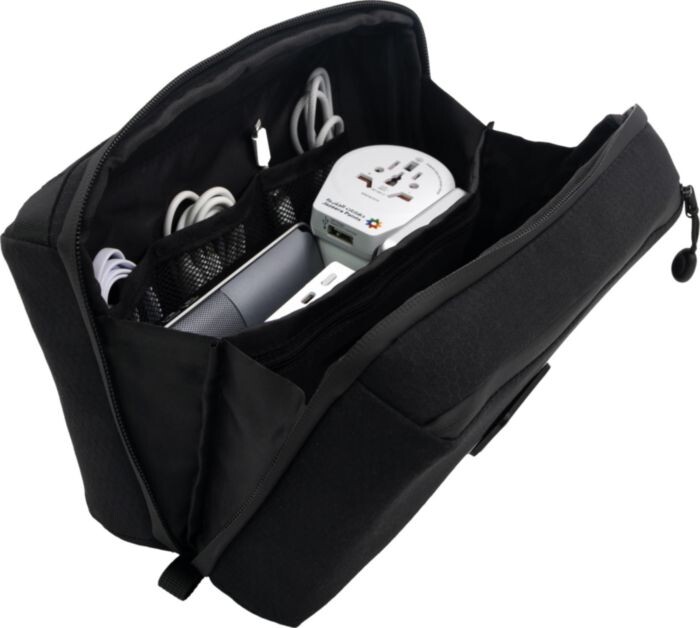 The Zen bag is a multifunctional, eco-friendly bag crafted from recycled PET bottles, ideal as a versatile corporate gift. It combines the functionality of a toiletry bag, tech organizer, and crossbody bag, with various pockets to hold personal care items or tech essentials. Standing upright on counters or hanging via a concealed metal hook, the Zen Bag adapts to any setting. Its durable semi-hard shell, weatherproof materials, waterproof zippers, and soft-touch, adjustable strap make it resilient yet comfortable for daily use. With its sleek design and multiple carrying options, Zen Bag is built for both style and durability. Dimensions: 16 x 26 x 10 cm