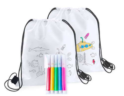 Turnbeutel für Kinder aus Non-Wowen mit 5 Filzstiften zum Ausmalen.
