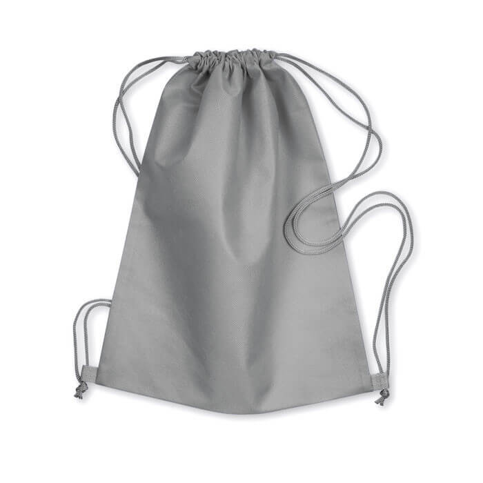 Nonwoven (80 gr/m?) drawstring backpack with PVC corners. The drawstrings are attached through metal rings.