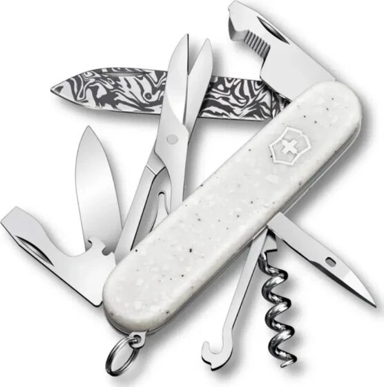 Special Companion Damast Limited Edition 2025 Unser 16. Taschenmesser in limitierter Auflage mit Klinge aus Damaszenerstahl, das dieses Jahr im Modell Special Companion in einer exklusiven Version mit mattweißen Griffen erscheint, ist für anspruchsvolle Sammler gedacht, die atemberaubendes Design und außergewöhnliche Verarbeitungsqualität zu schätzen wissen. Dieses auf 7.000 Exemplare weltweit limitierte Modell ist mit einer Klinge aus 264 Lagen Damasteel®-Stahl in einem einzigartigen Muster namens Svavner mit einer Härte von 60 HRC erhältlich. Die Oberfläche der Griffe besteht aus einer Mischung aus Acrylharz und natürlichen Mineralien, wobei die einzelnen Schuppen die Optik von Naturstein annehmen und so raffinierte Eleganz perfekt verkörpern. Damasteel® ist das Ergebnis handwerklicher Arbeit, deren Ursprünge mehr als tausend Jahre zurückreichen. Damaszenerstahl wird nach einem patentierten metallurgischen Verfahren hergestellt, das mit der Zerstäubung von Stahl mit einem Gas beginnt, bei dem geschmolzener Stahl durch eine Düse gepresst und zerstäubt wird. Die Pulver werden in einem Verfahren namens Heißisostatisches Pressen (HIP) geschichtet, versiegelt, verdichtet und verbunden. Der Schichtungsprozess definiert dann das Muster des Endprodukts vor. Das Material wird dann geschmiedet, strukturiert, gewalzt und gedreht, um sein einzigartiges Muster zu erhalten, ein Verfahren, das traditionellen Techniken ähnelt. Das Muster des Damaszenerstahls wird erst sichtbar, nachdem die Oberfläche geätzt wurde, wobei die beiden verschiedenen verwendeten Stahlsorten (in verschiedenen Schichten) aufgrund ihrer Zusammensetzung unterschiedlich auf Oxidation reagieren. So entsteht durch die geniale Kombination aus einzigartiger Ästhetik und bemerkenswerter Qualität ein einmaliges Sammlerstück. Das Ergebnis ist ein Messer, das die Kraft des Einfallsreichtums gepaart mit dem Streben nach Perfektion verkörpert. Taschenmesser beinhaltet: 1. Klinge, groß 2. Korkenzieher 3. Kronkorkenöffner 4. 6-mm-Schraubendreher 5. Drahtabisolierer 6. Durchschlag-/Stechreibahle 7. Schere 8. Mehrzweckhaken 9. Schlüsselring 10. Paketöffner 11. 3-mm-Schraubendreher Verpackung: spezielle Geschenkverpackung.