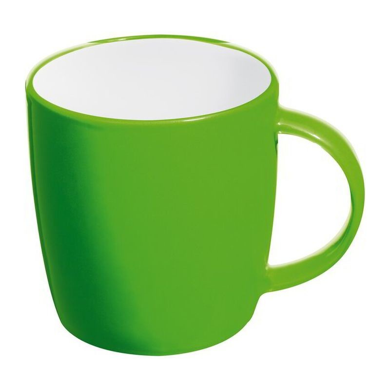 Wir bieten einen Keramikbecher mit Löffel in vier verschiedenen Farben an. Der Inhalt der Becher beträgt 250 ml.