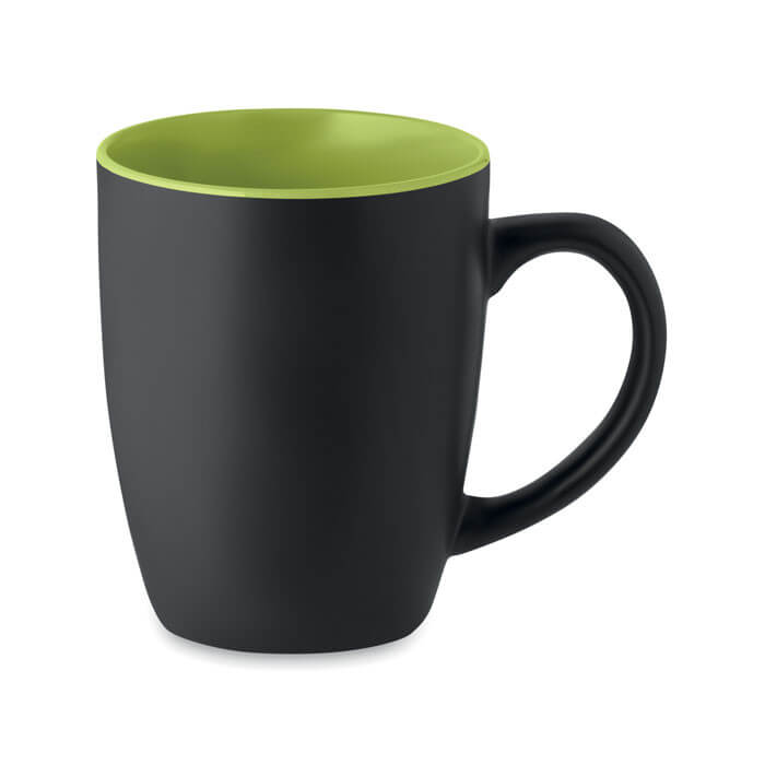 Keramikbecher mit einem Volumen von 330 ml mit einer speziellen Sublimationsdruckschicht, mit farbigem Henkel und Innenraum.