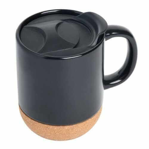 Hochwertiger Keramikbecher mit Naturkork und PP-Kunststoffdeckel zum Trinken. Mit einer matten Außen- und einer glänzenden Innenoberfläche. 325 ml. In einer Kraftpapierbox.