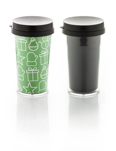 Doppelwandiger Isolierbecher aus Kunststoff für personalisierte Einleger. Lieferung in weißer Kartonbox. Füllinhalt: 250 ml.