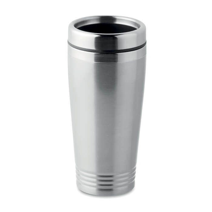 Stainless steel double-walled drinking mug (300 ml) with a PP lid and silicone grip. Keeps contents hot for 4 hours and cold for 6 hours. The interior is made of stainless steel 304, and the exterior is stainless steel 201. Individually packaged in a brown cardboard box. Dimensions: 8,5 x 8,5 x 13 cm