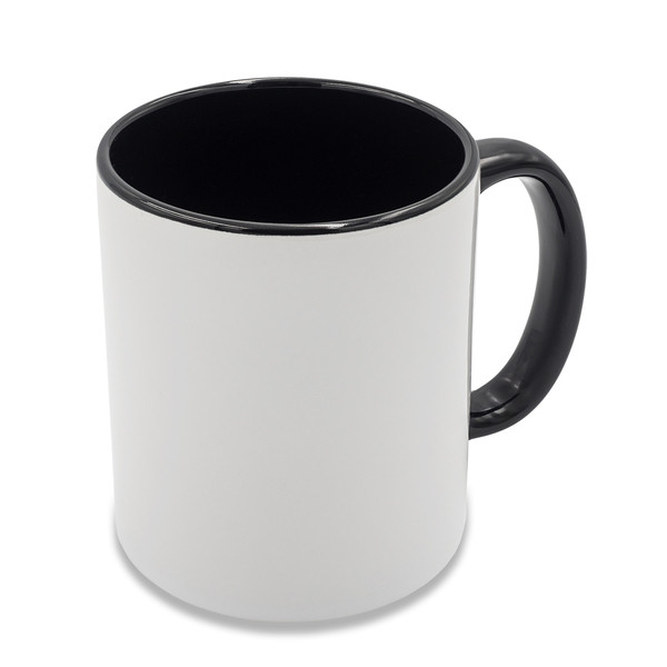 Keramikbecher mit einem Volumen von 330 ml mit einer speziellen Sublimationsdruckschicht, mit farbigem Henkel und Innenraum.