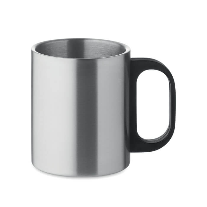 Doppelwandiger Isolierbecher aus Metall mit Kunststoff-Griff. Lieferung mit weißer Kartonbox. Füllinhalt 450 ml.