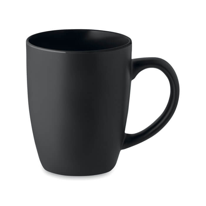 Schwarzer Kaffeebecher aus matter Keramik. Glänzende, farbige Innenseite. Füllmenge: 290 ml. Mit einer speziellen Beschichtung für Lasergravur