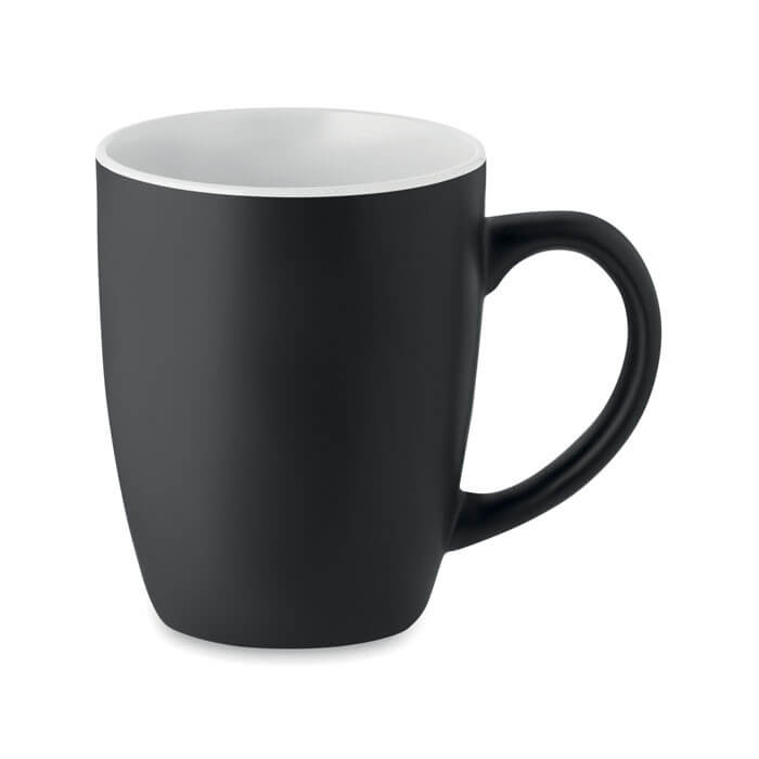 Schwarzer Kaffeebecher aus matter Keramik. Glänzende, farbige Innenseite. Füllmenge: 290 ml. Mit einer speziellen Beschichtung für Lasergravur