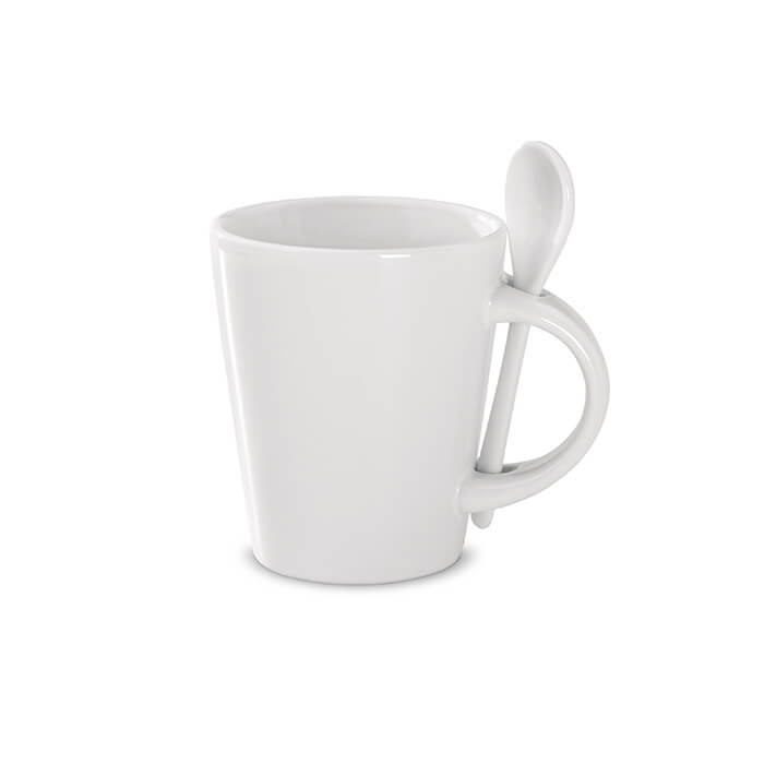 Tasse aus Keramik mit Löffel. Spezielle Beschichtung für Sublimationsdruck. Füllmenge: 300 ml. Verpackt in einem weißen Karton. Für einen langanhaltenden Sublimationstransfer empfehlen wir Spülmaschinenreinigung bis max. 40°C. Tampondruck ist nur für die leichte Handwäsche geeignet.