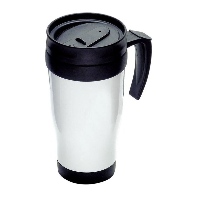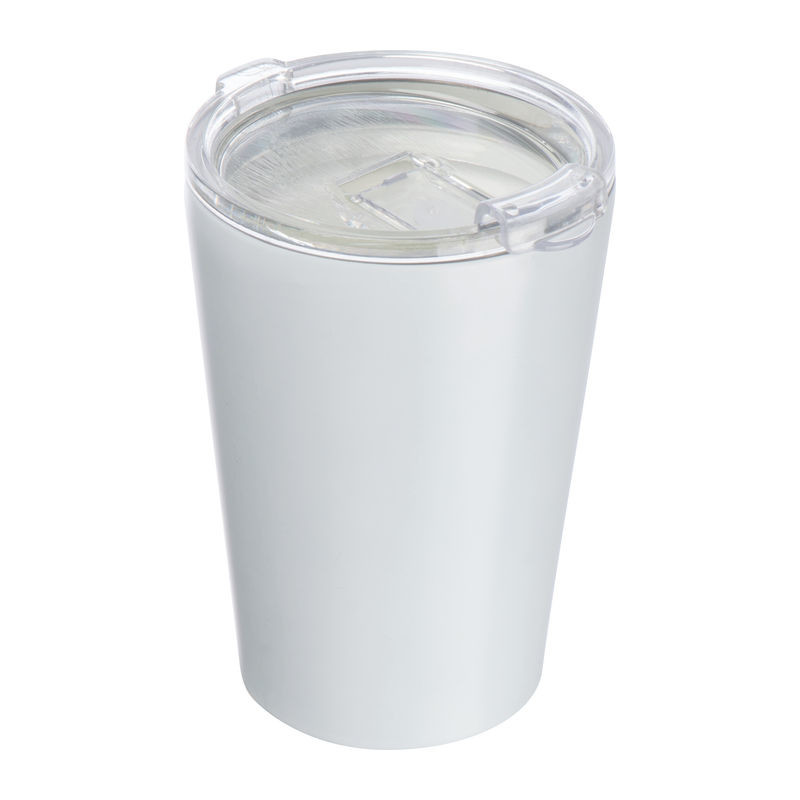 Doppelwandiger Edelstahl-Reisebecher (400 ml), auslaufsicher – weiße Außenseite und Edelstahl-Innenseite.