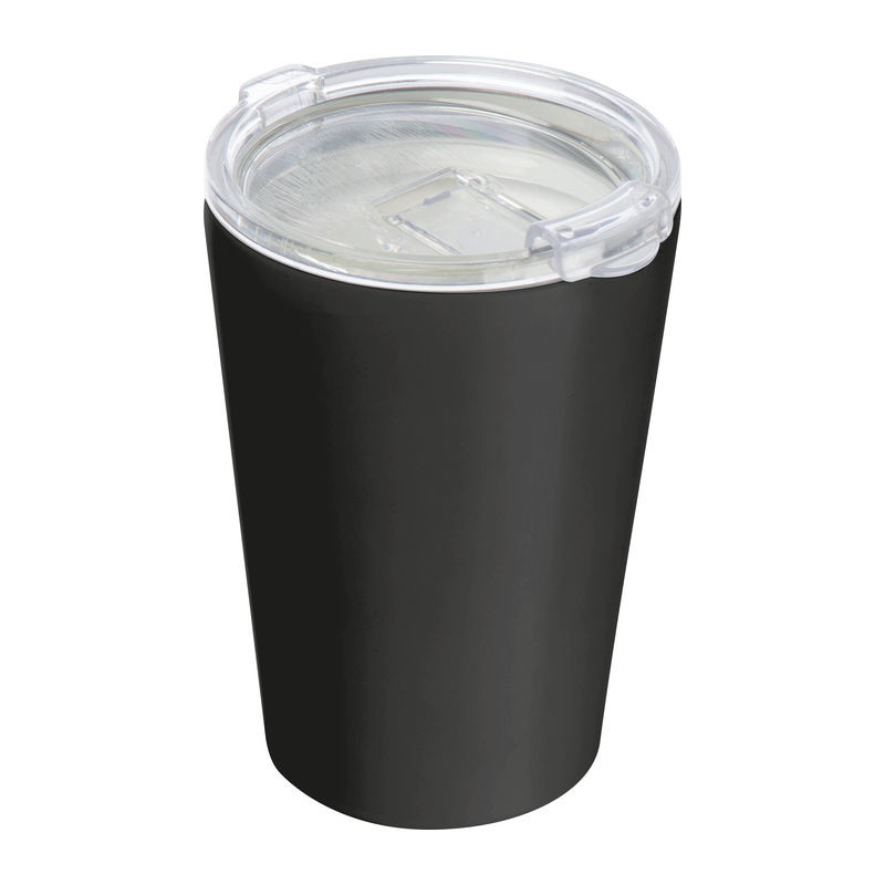 Reisebecher aus Edelstahl und PP, 350 ml. Die Klappkappe verfügt über einen Silikondichtring. Einzeln verpackt im braunen Karton. Abmessungen: ∅8,9x15cm.