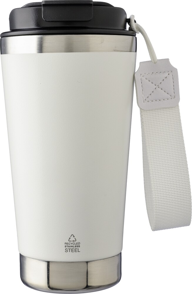 Recycled stainless steel double-walled drinking mug (500 ml) with a PP lid and matching carrying strap. The interior is made of stainless steel 304, and the exterior is stainless steel 201. Keeps contents hot for 5 hours and cold for 8 hours. Recycled logo engraved on the bottle. Individually packaged in a brown cardboard box. Dimensions: 9 x 9 x 18 cm