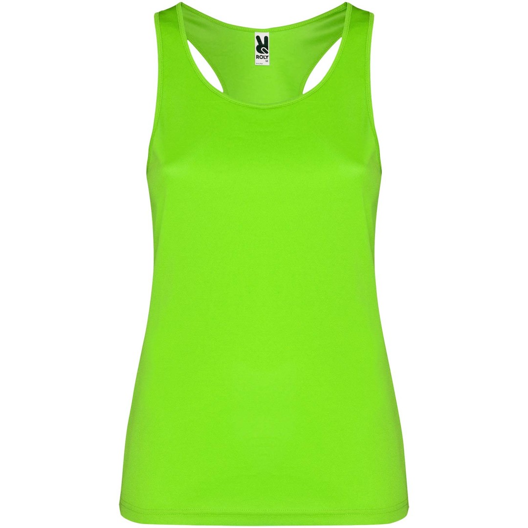 ·140 g/qm ·100% Polyester ·Optimaler Feuchtigkeitstransport und schnelltrocknend ·Eingefasster Hals- und Armausschnitt ·Kein Textiletikett, Produktinfos sind eingedruckt ·Racer Back ·Seitennähte ·Feminine Passform.