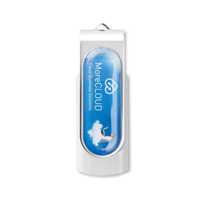Twister style USB stick in plastic and metal. You can choose any color combination, storage capacity, lanyard, or packing. Doming is possible on one or two sides (on silver plates only!)