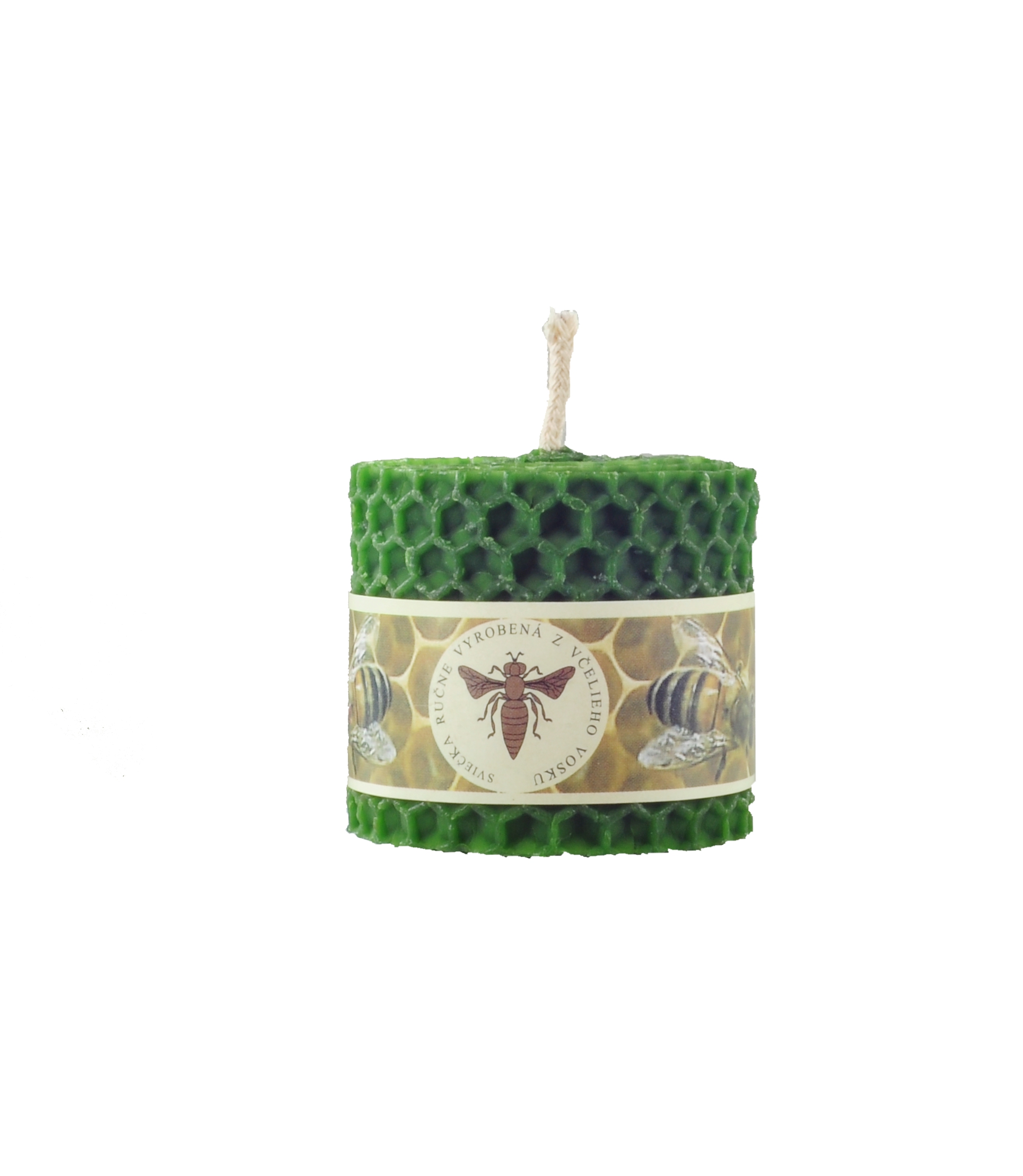 Aus der Trennwand gewickelte farbige Bienenwachskerze. Größe: 40x40mm. Gewicht: 25g
