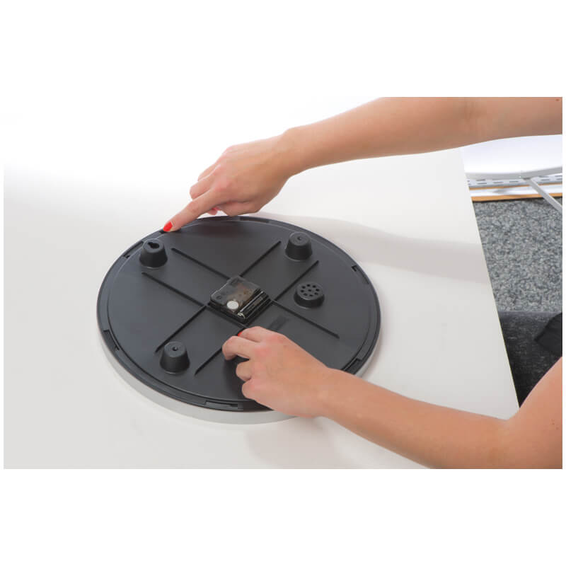 Runde analoge Wanduhr aus Kunststoff mit austauschbarem Ziffernblatt (weiß/schwarz); Lieferung ohne Batterien (1x AA Batterie). Auf Anfrage auch mit individuellem Design auf dem Ziffernblatt möglich.