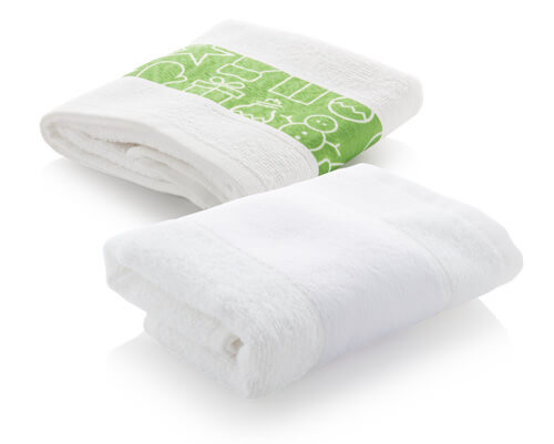Wendehandtuch mit einseitigem Sublimationsdruck. 100 % Baumwolle + 100 % Mikrofaser, 400 g/m². Der Preis beinhaltet den Sublimationsdruck, nicht die Druckvorbereitung. Mindest. viele 50 Stück.