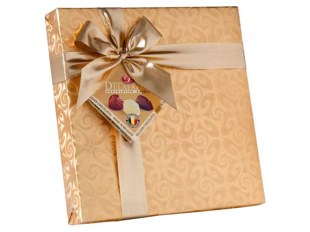 Die luxuriöse Pralinenschachtel enthält 16 gefüllte belgische Pralinen aus Vollmilch-, Zartbitter- und weißer Schokolade. Die Pralinen sind sorgfältig in einer eleganten Goldbox mit Goldband verpackt und somit ein ideales Geschenk für alle Liebhaber hochwertiger Schokolade. Sie enthält 8 Stück Vollmilchpralinen, 4 Stück Zartbitterschokolade und 4 Stück weiße Schokolade.