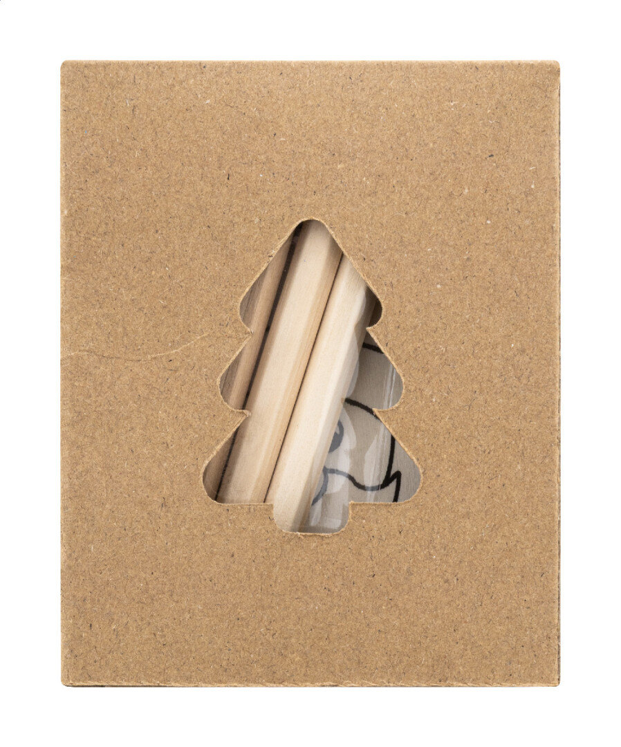 Weihnachtsornament-Malset in einer Kraftpapierbox mit geschnitztem Weihnachtsbaum. Enthält 3 Holzornamente mit Hanfschnur und 4 Buntstifte.