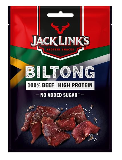 Jack Link’s Biltong Original – mageres Rindfleisch, nach Familienrezept mariniert, langsam luftgetrocknet und nach traditioneller südafrikanischer Art in dickere Scheiben geschnitten. Hoher Proteingehalt, geringer Zuckergehalt, mit mild-würzigem Geschmack. Biltong ist saftiger als klassisches Jerky und bietet ein authentisches Erlebnis für alle Fleischliebhaber. Zutaten: Rindfleisch (229 g pro 100 g Fertigprodukt), Essig, Jodsalz, Zucker, Dextrose, Gewürze, Maisstärke, Zwiebelpulver, Zwiebeln, Tomaten, Paprika, Pfefferextrakt, Hefeextrakt, Raucharoma, Konservierungsstoffe (Natriumnitrit, Kaliumsorbat), Salz. Gewicht: 25 g