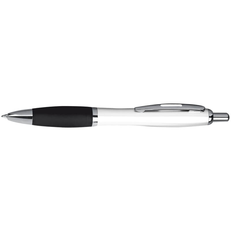 Kunststoffkugelschreiber mit blauer Mine, Metallschnalle und farbigem Gummigriff. Der Körper des Stiftes ist weiß.