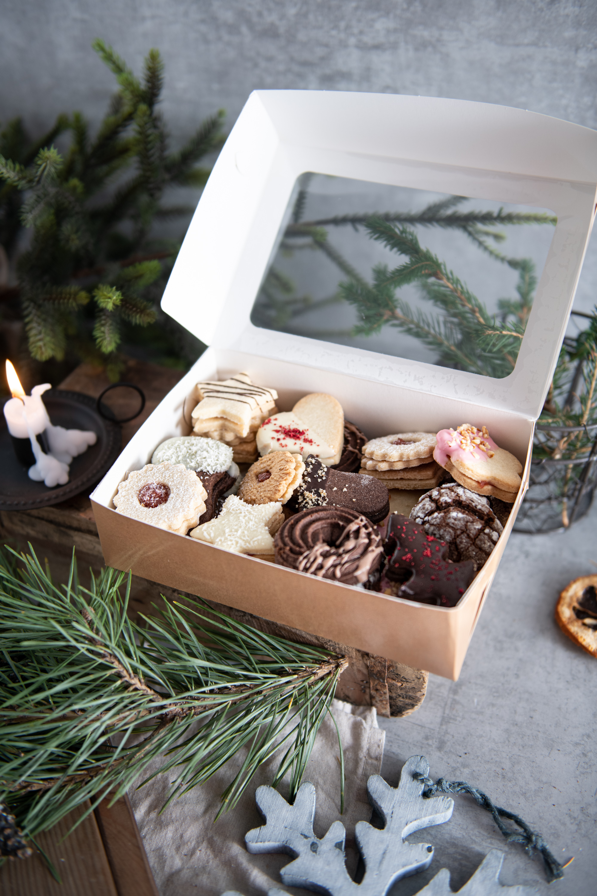 Eine Mischung aus Linnaeus-Gebäck, beklebt mit Marmelade und dekoriert mit Weihnachtsdekorationen.