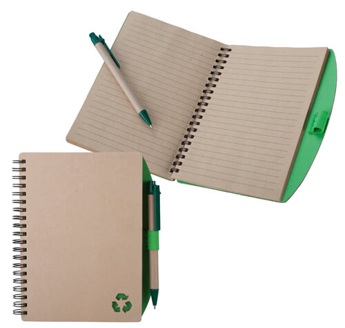 Aus Recycling Papier hergestelltes Notizheft mit 80 linierten Seiten, inklusive Kugelschreiber aus Recycling Papier mit blauer Mine.