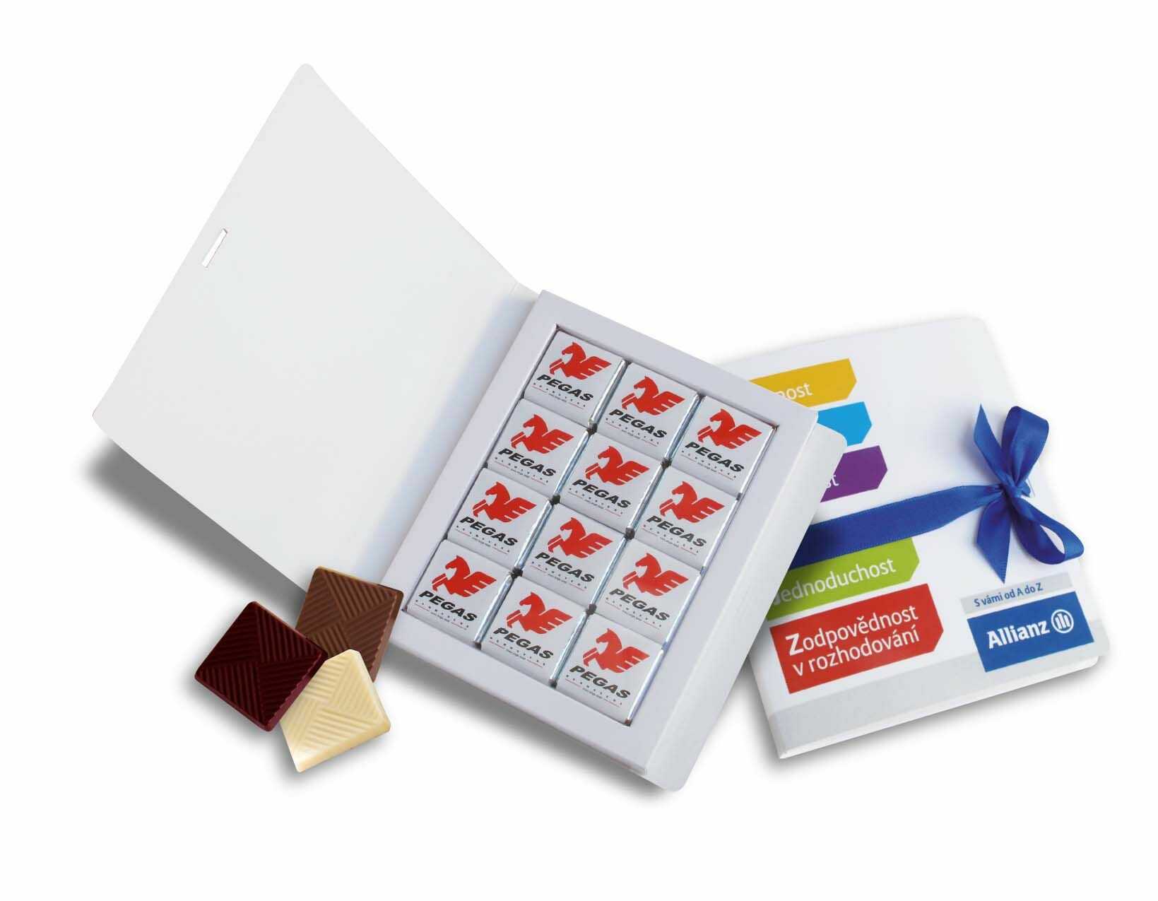 Schokoladenbuch 24x5g enthält kleine Pralinen Ihrer Wahl. Wir bedrucken jede Schokolade und auch den Einband dieses Schokoladenbuchs selbst. Die Bindung erfolgt je nach Verfügbarkeit und Musterbuch mit einem Band.