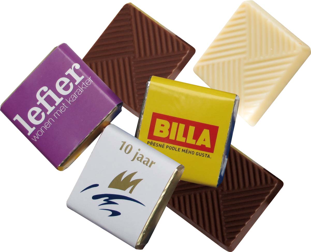 Werbeschokolade 20g mit Logo, verpackt in Klarsichtfolie.