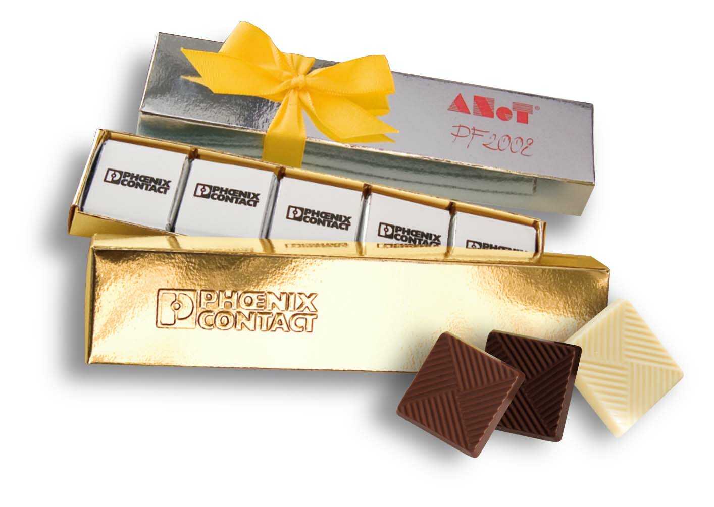 Gold- oder Silberziegel mit 10 x 5 g Pralinen und bedruckter Schokoladenhülle.