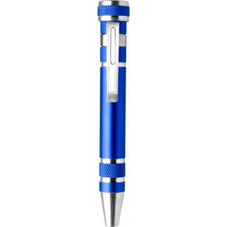 Steel pen shaped screwdriver with four flat head and four Philips screwdriver bits and aluminium accents and clip.