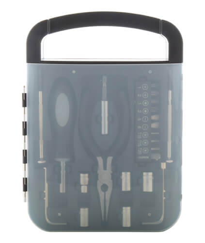 22-teiliges Werkzeugset in Kunststoffbox. Inhalt: 2 Schraubenzieher, 1 Kombizange, 1 Griff, 2 Winkelschraubendreher, 5 Steckschlüsseleinsätze, 10 Bits.