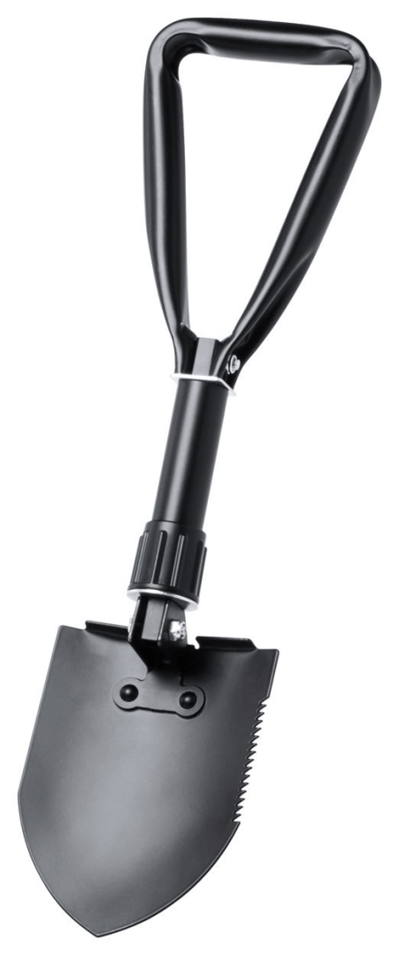 Klappschaufel aus Metall, mit Kompass und Gummigripp. Geliefert in einer 600D Tasche.
