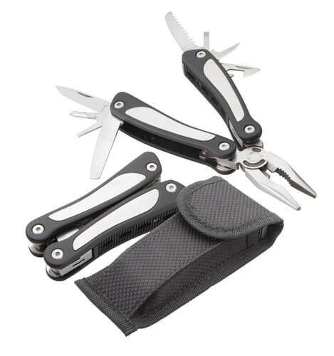 Multifunktionswerkzeug aus Edelstahl mit neun Funktionen: Zange, Nagelfeile, drei Schraubendreher, Messer in zwei Größen, Dosenöffner und Säge. Lieferung in einem schwarzen Polyester-Etui.
